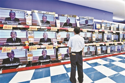 当地时间2016年8月7日,日本明仁天皇发表视频讲话,表示由于身体原因,很难履行自己的职责。在日本东京, 民众通过街头大屏幕和电视机等聆听天皇视频讲话供图/视觉中国
