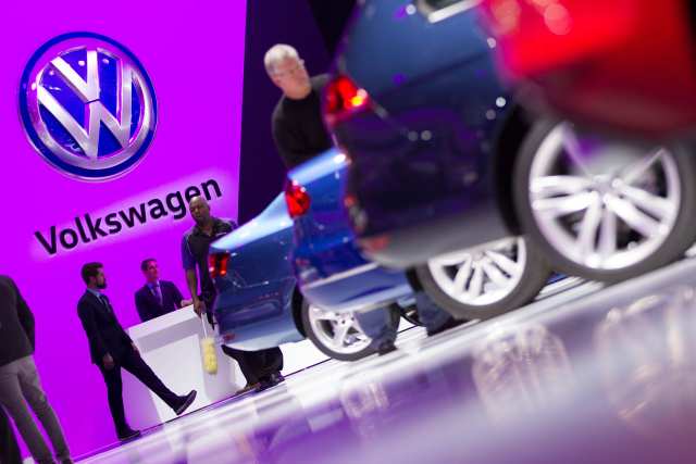 图为1月12日在美国底特律举行的北美国际汽车展上的大众汽车公司展台。(新华社/法新)