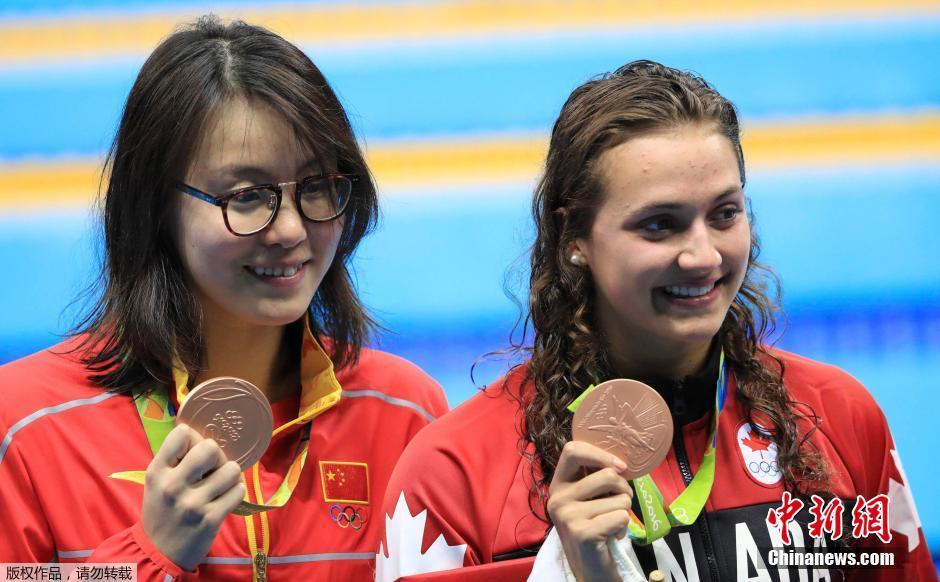 当地时间8月8日,在2016里约奥运女子100米仰泳决赛上,中国选手傅园慧以58秒76夺得铜牌。图为傅园慧(左)登台领奖。