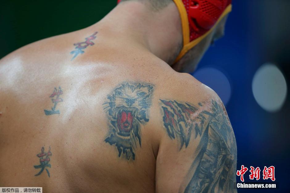 黑山男子水球队的守门员Zdravko Radic背部及胳膊上的猛兽纹身。