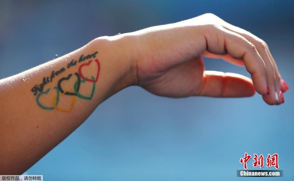 匈牙利女子水球队员Barbara Bujka小臂上的奥运五环纹身。