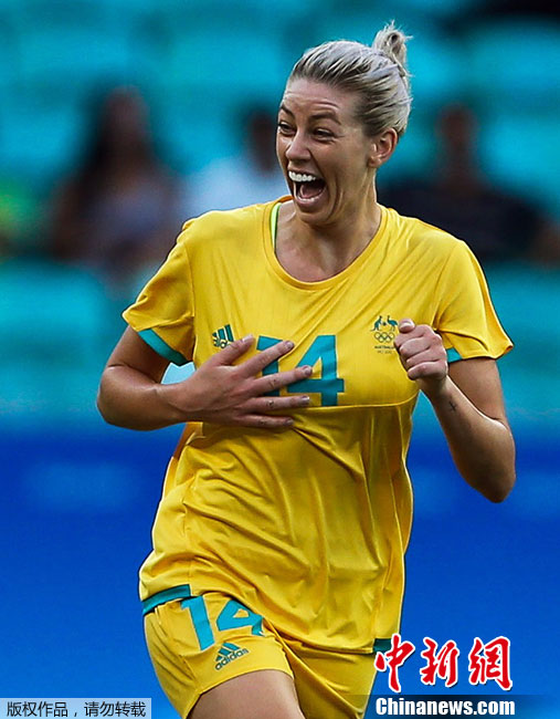 8月9日,里约奥运会女足小组赛,澳大利亚对阵津巴布韦,澳大利亚运动员Alanna Kennedy庆祝进球。