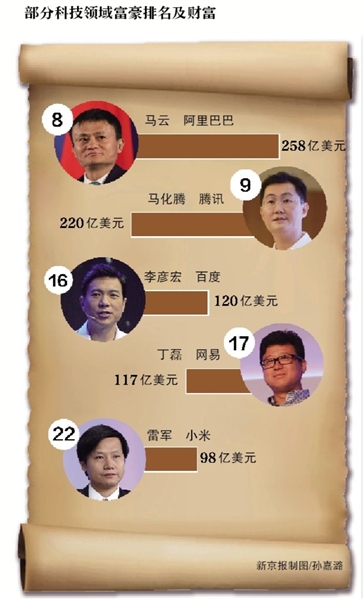 在中国互联网和智能手机热潮的推动下,来自中国的科技富豪占到了总榜单的五分之一。马云建立的电子商务企业阿里巴巴于2014年在纽交所上市,成为历史上最大规模IPO,马云本人在《2015胡润百富榜》上居于第二位,仅次于万达董事长王健林。马化腾创立的腾讯,在社交、媒体、电商、游戏等领域都有涉猎,旗下微信产品用户数已经达到了7.6亿人。