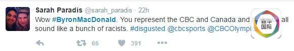 加拿大网友萨拉·帕拉迪斯在网上说,你(拜伦)代表着加拿大广播公司CBC,代表着加拿大,你说得好像我们加拿大人都是种族歧视者似的。