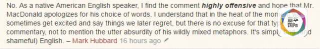 美国人马克·哈伯德说,我认为这句话极度无礼,希望拜伦能够就此道歉。我能理解当人们变得很激动时会说一些自己都会后悔的话,但这并不是拜伦说出此番言论的理由,更不用说他这句话中“疯狂混合”起来的暗喻根本就是不合理的。这就是不好的(可耻的)语言。