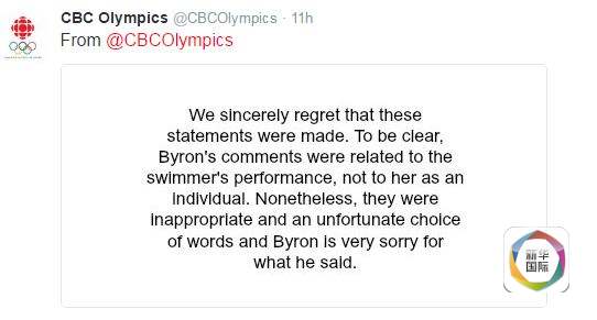 加拿大广播公司说,我们对拜伦的言辞表示真诚的歉意,需要澄清的是,拜伦的言论只针对运动员的表现,而不针对运动员个人。不过,这些话依旧是不恰当的,拜伦对他的言辞表示十分抱歉。
