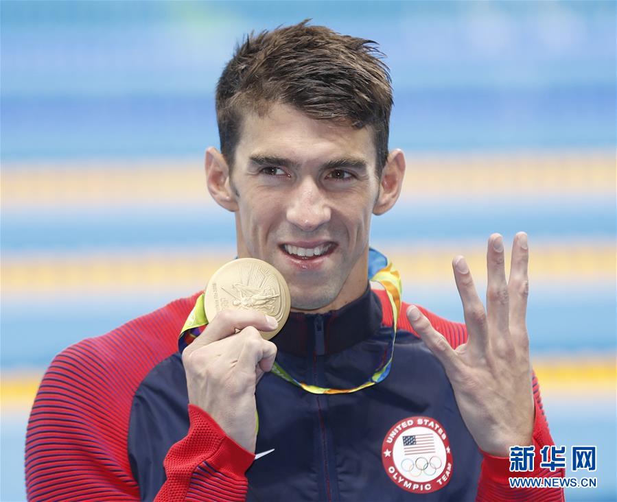 8月11日,美国选手菲尔普斯在颁奖仪式上庆祝获得四枚金牌。当日,在2016年里约奥运会游泳男子200米个人混合泳决赛中,美国选手菲尔普斯以1分54秒66的成绩夺冠。 新华社记者费茂华摄
