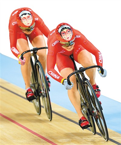 身着一袭红衣、头戴印着穆桂英和花木兰京剧脸谱的头盔,8月12日,中国姑娘宫金杰/钟天使组合飞驰在里约奥运会场地自行车比赛馆。