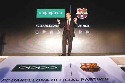 去年9月8日,西甲巴塞罗那俱乐部与OPPO手机在北京召开联合新闻发布会,宣布自2015-2016赛季开始,OPPO正式成为巴塞罗那俱乐部官方合作伙伴。图为巴塞罗那俱乐部副主席佩雷斯在新闻发布会上致辞。