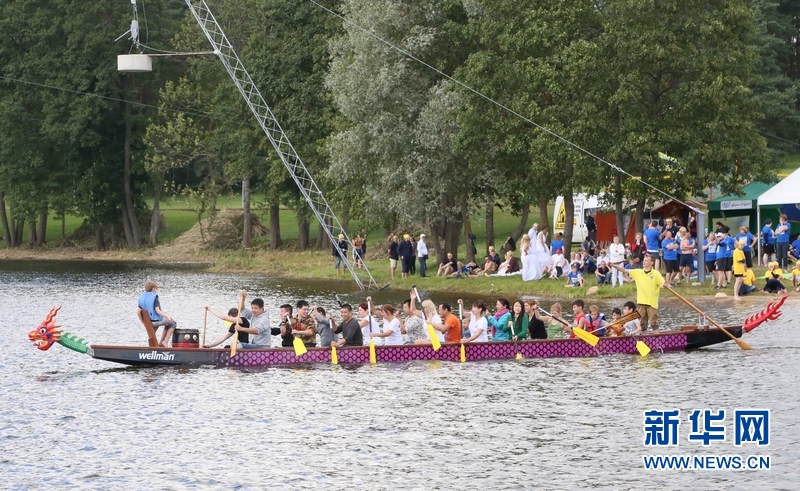 8月14日,在立陶宛扎拉赛,华侨华人参赛队员将龙舟划向比赛场地。新华网记者卜鹏摄