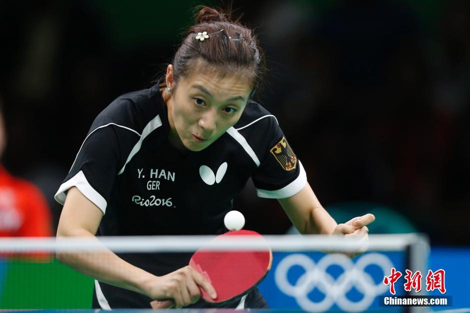当地时间8月16日,2016里约奥运乒乓球女团决赛打响,中国队对阵德国队。图为韩莹在比赛中。中新网记者 盛佳鹏 摄