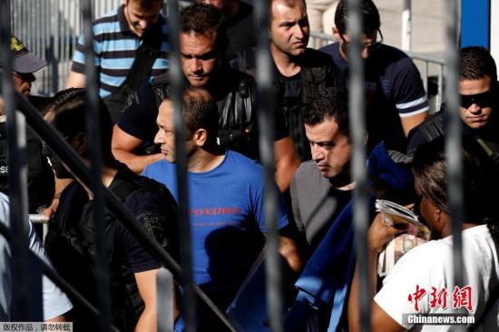 当地时间7月27日,希腊雅典,参与土耳其未遂政变后逃到希腊的8名土耳其军人被押送至警察局,他们此前提出的避难申请审核被延期一个月。