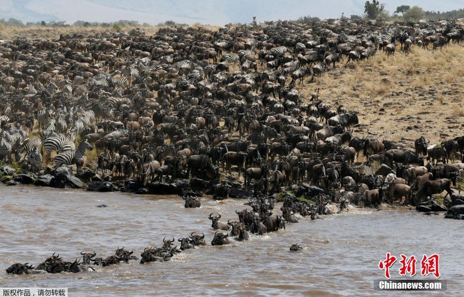 当地时间8月15日,大批牛羚(角马)迁徙途径肯尼亚Serengeti。图为牛羚穿越Mara河。