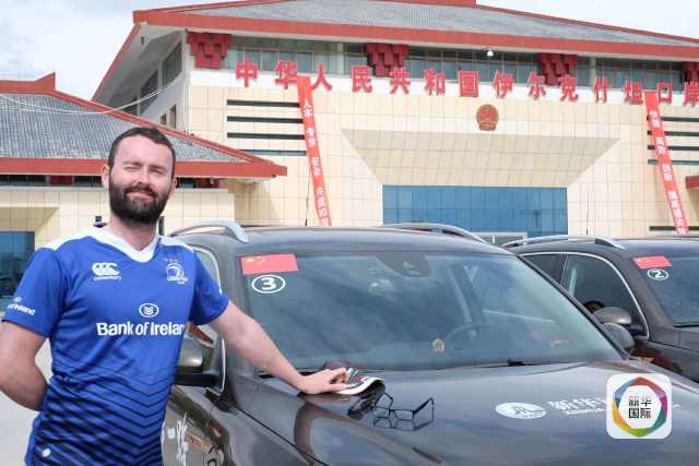 即将踏上新华社“一带一路全球行”境外段的记者在新疆伊尔克什坦口岸遇见游历中国多地后即将出关前往中亚的爱尔兰旅行者汤姆·达维特(Tom Davitt)。