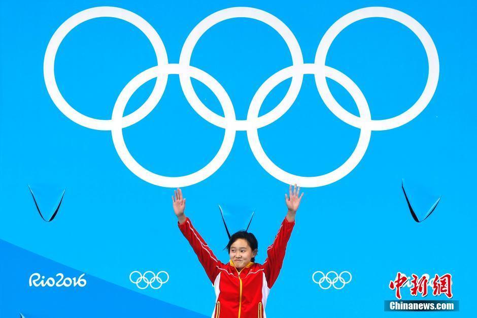 当地时间8月18日,在里约奥运女子跳水单人十米台的决赛中,2001年出生的小将任茜发挥出色,完美五跳后得到439.25的超高分数,摘得金牌。中新网记者 富田 摄