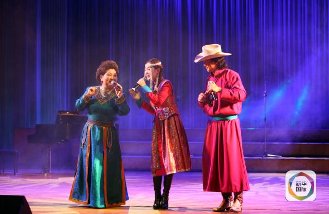 图为8月18日,中国著名蒙古族艺术家布仁巴雅尔和乌日娜夫妇携女儿诺尔曼在乌兰巴托中央文化宫演唱《吉祥三宝》。(新华社记者郑闯摄)