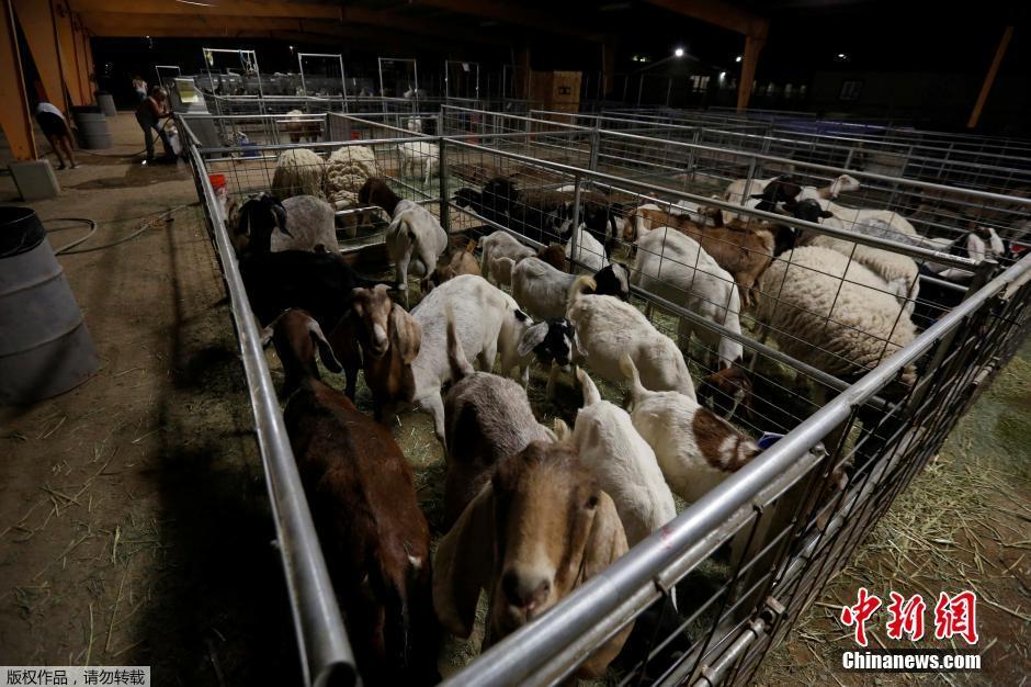 当地时间2016年8月18日,美国加州。加州南部圣伯纳迪奥县境内16日上午突发严重山火,火势迅速蔓延,目前过火面积已超过3万英亩(约合122平方公里)。尽管700余名消防人员和10余架灭火飞机昼夜扑救,但受强风和连日高温干旱影响,山火面临失控风险。图为一些得救的山羊被安置在临时避难所中。