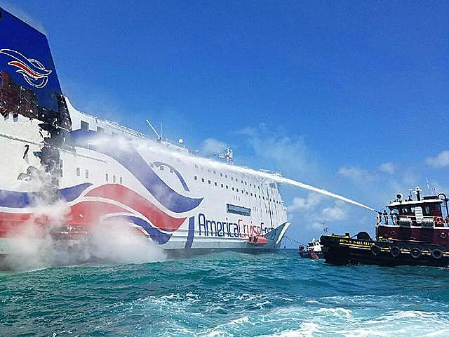 8月17日,一艘波多黎各拖船向起火的“加勒比梦幻”号渡轮喷水灭火。(图片来源:新华/美联)