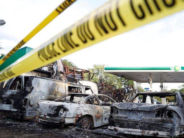 冲突中焚毁的车辆。(图片来源:新华/路透)