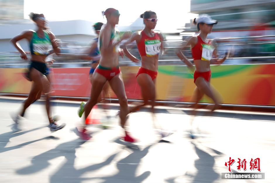 当地时间8月19日,里约奥运女子20公里竞走决赛,中国选手刘虹以1小时28分35秒摘取金牌,墨西哥选手冈萨雷斯获得银牌,吕秀芝获得铜牌,另一位中国选手切阳什姐名列第五。图为刘虹和吕秀芝在比赛中。中新网记者 富田 摄