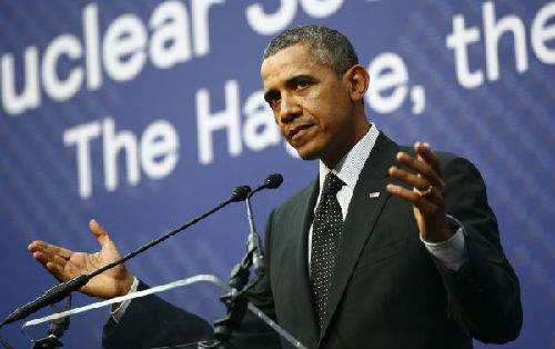 资料图片:2014年3月25日,在荷兰海牙的第三届核安全峰会主新闻中心,美国总统奥巴马在与荷兰首相吕特举行的闭幕新闻发布会上讲话。 新华社发