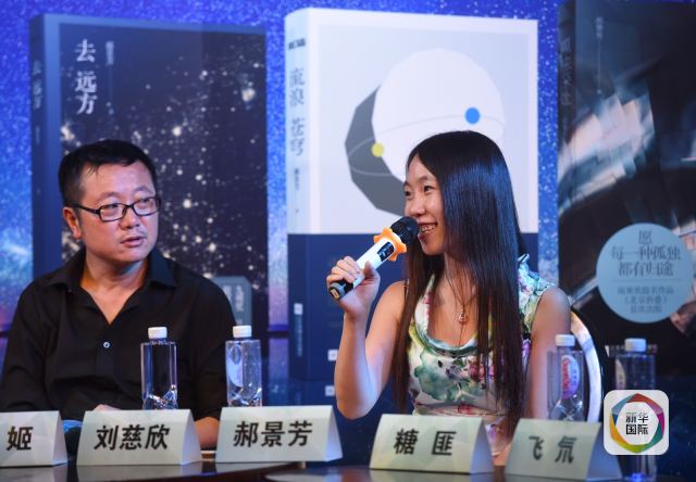 图为7月23日,郝景芳(右)在读者见面会上介绍创作理念。(新华社记者罗晓光摄)