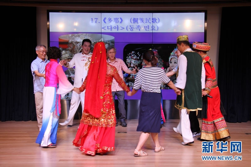 8月19日,在驻韩中国文化中心举办的“风从东方来”中国民歌体验交流活动上,中国歌唱家们与韩国观众互动,在侗族民歌声中共舞