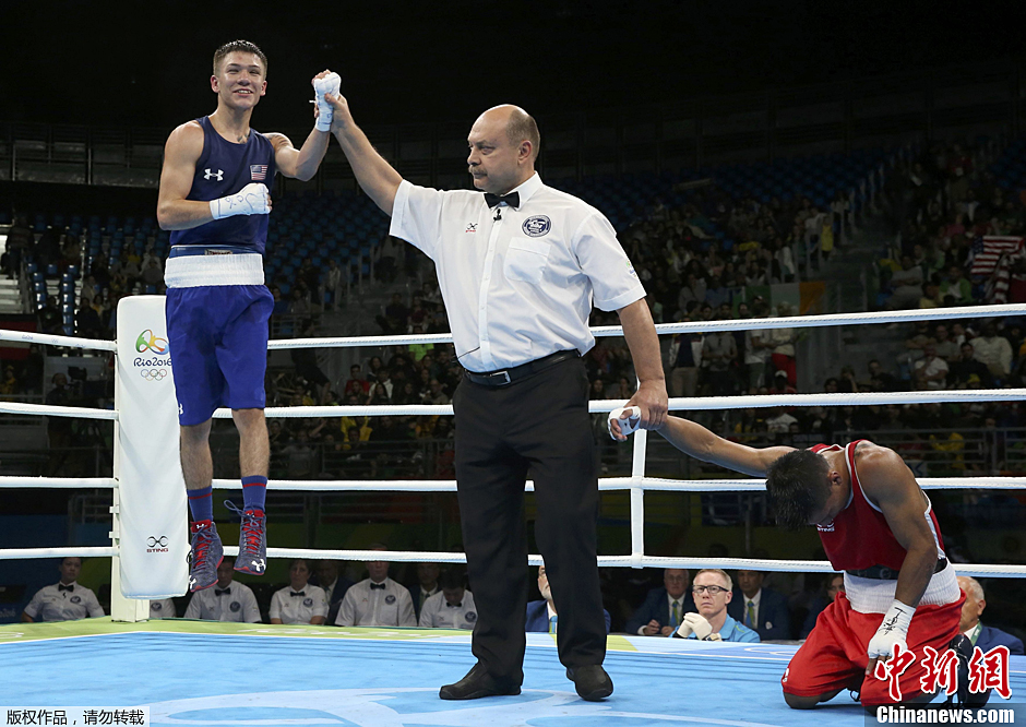 当地时间8月10日,男子49公斤级拳击赛场,美国选手获胜后在场地上蹦起来。