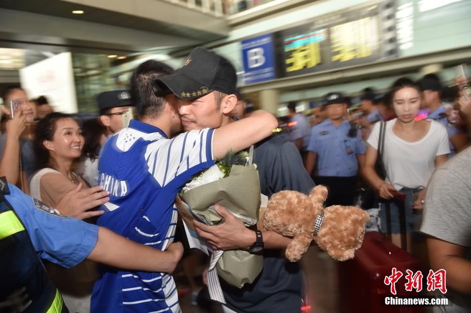 8月22日,中国奥运羽毛球队抵达首都机场,被早已等候在现场的球迷层层包围。图为林丹走出机场,受到好友鲍春来的热情迎接。中新网记者 金硕 摄
