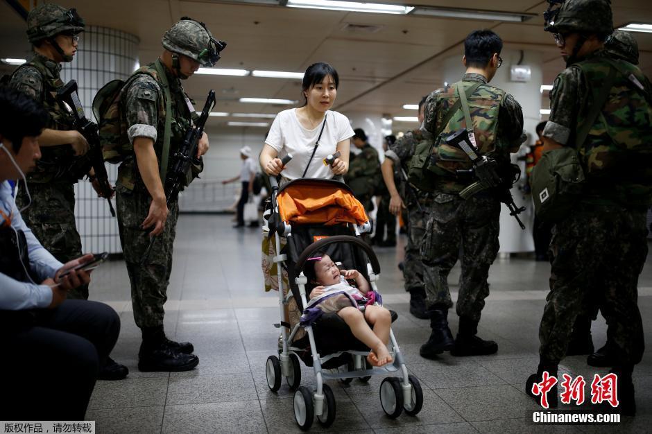 当地时间2016年8月23日,韩国首尔,首尔地铁站举行反恐训练,该训练是韩美“乙支自由卫士军演”的一部分。图为一名民众推婴儿车经过。