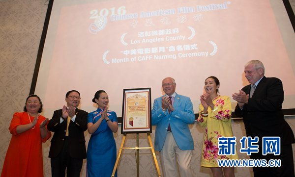8月22日,洛杉矶郡行政长官麦克·安东诺维奇(右三),中美电影节主席、美国鹰龙传媒董事长苏彦韬(左二),奥斯卡奖得主、中美电影节共同主席安德鲁摩根(右一),中美电影节共同主席胡惠玲(右二),中国驻洛杉矶总领事馆文化领事王瑾(右四)和中美电影节组委会执行总裁林淑婷(左一)在命名仪式上。为感谢中美电影节连续12年推动中美文化交流所做出的杰出贡献,洛杉矶郡将2016年11月命名为“中美电影节月”,并将在11月与中美电影节共同举办系列活动,庆祝这一中美两国电影文化产业的年度盛事。新华网记者杨磊摄