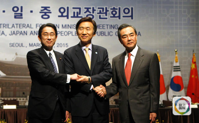 2015年3月21日,中国外交部长王毅(右)与韩国外交部长尹炳世(中)、日本外相岸田文雄在第七次中日韩外长会前合影。 (新华社记者姚琪琳摄)