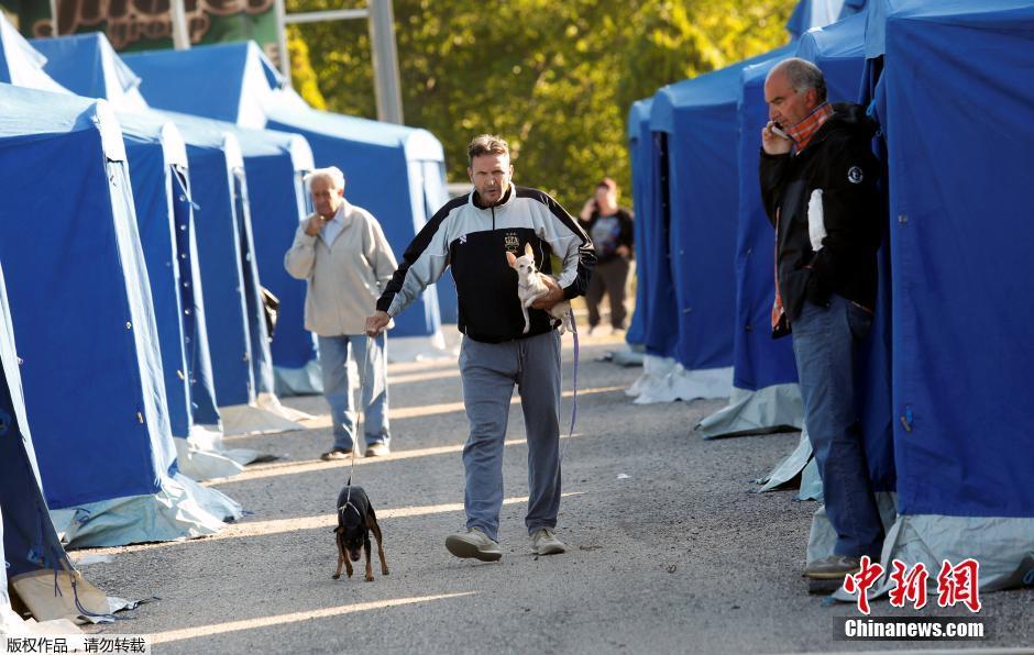 当地时间2016年8月25日,一位意大利地震受灾民众在安置点的帐篷间遛狗。