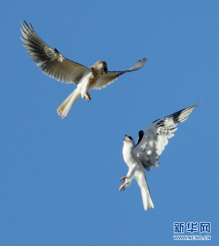 近日,在美国加利福尼亚州帕洛阿尔托市的一个山丘,数只白尾鸢聚集于此,上演空中打斗嬉闹的好戏。白尾鸢属鹰科,飞行能力高超,善于空中悬停。作为一种猛禽,白尾鸢彼此间的游斗、追打和嬉闹,充满了鹰的豪气。 新华网发(董旭东摄)