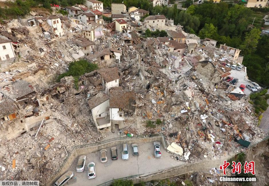 8月26日消息,据外媒报道,意大利中部24日发生强烈地震后,救援队伍仍在积极寻找幸存者。目前确认遇难人数目前已上升至250人。各方担心,伤亡数字还会进一步攀升。图为航拍地震灾区,所见之处一片废墟。