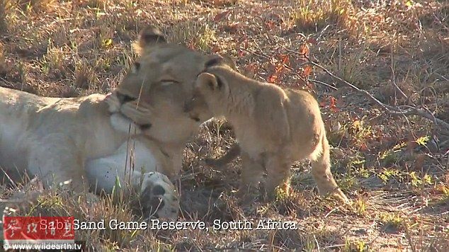 狮子宝宝慢慢地来到母亲身边,用自己的头蹭着正在睡觉的母亲,似乎是想母亲叫醒和它一块玩耍。