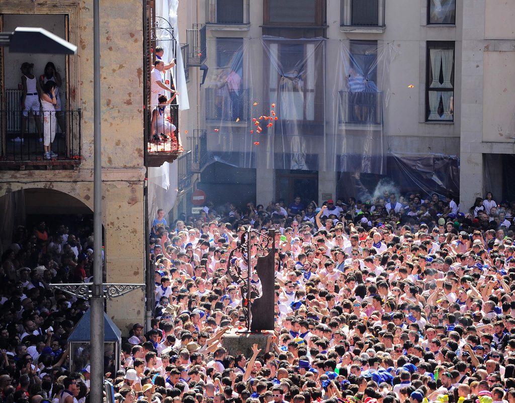 当地时间2016年8月27日,西班牙塔拉索纳,狂欢者向装扮成小丑的男子投掷西红柿,这名小丑代表着西珀特加多神,这名西珀特加多神在人群中穿梭,穿梭的路线只有他自己一个人知道。当西珀特加多神抵达西班牙广场的尽头,将会攀爬到纪念雕塑之上,这标志着当地主要节日活动的启动。