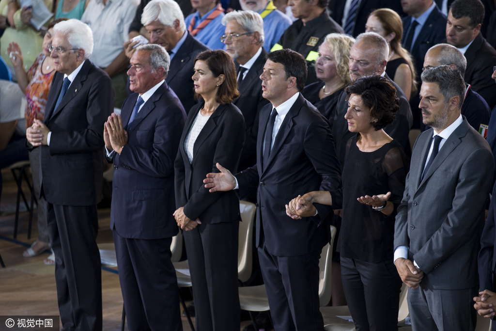 当地时间2016年8月27日,意大利阿斯科利皮切诺,地震遇难者葬礼在体育馆举行。包括意大利总统马塔雷拉与意大利总理伦齐在内的政要出席葬礼。