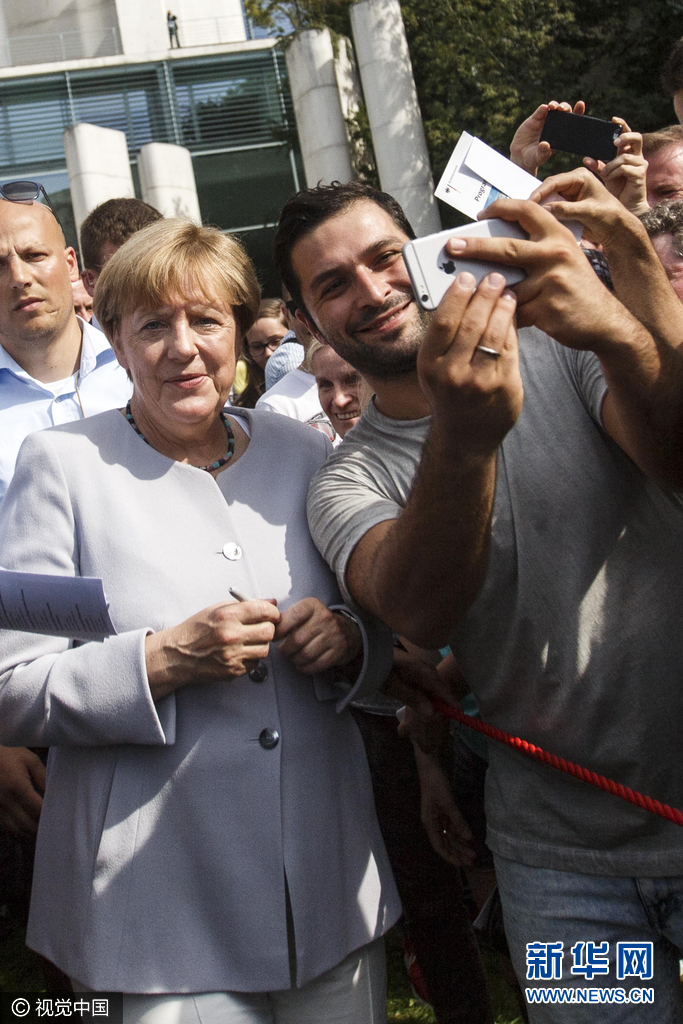 当地时间2016年8月28日,德国首都柏林又迎来了一年一度的联邦政府开放日,总理默克尔与参观者亲切交流。图片来源:视觉中国