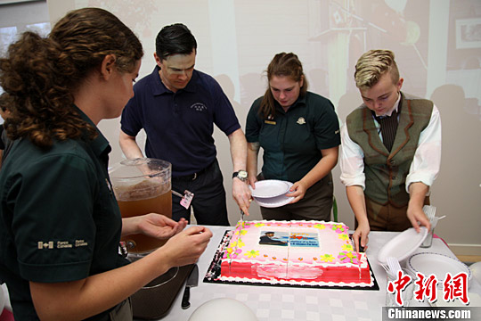 纪念活动当天,纪念馆馆长斯科特·戴维森(左二)等切开为纪念馆特定的蛋糕,与来宾和游客们分享,共同庆祝并怀念白求恩医生。中新社记者 徐长安 摄