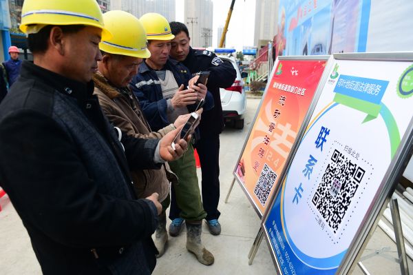 资料图:在合肥中建三局一处工地上,农民工通过手机扫描法律服务二维码。 新华社记者 杜宇 摄