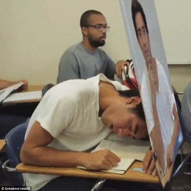这块肖像板为真人大小,远远看去确实真假难辨,但随着镜头的拉近,一切都原形毕露。最后,这名男子的邻座戳了戳他把他叫醒,他一动,肖像板就掉了,令人忍俊不禁。