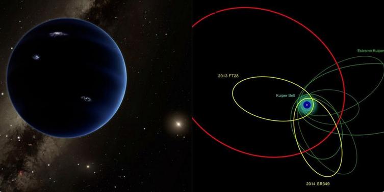 归功于科技的发展,天文学家在太阳系边缘发现许多“极端物体”(extreme objects),它们群集的情况让科学家猜测,它们有可能是在一个像木星一样的大型行星的轨道上回转,天文学家因此猜测这个行星可能就是“第九大行星”。图为艺术家绘制的第九大行星可能的模样。