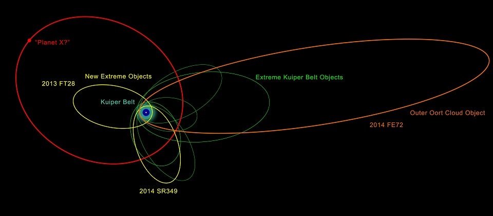 天文学家因此猜测太阳系边缘、可能有一颗运行轨道极端椭圆和长、可能比地球大至少15倍的行星,这也就是常被科学家称之为可能存在的“第九行星”(Planet Nine)或“X星”(Planet X)。图为艺术家绘制的第九大行星可能的模样。