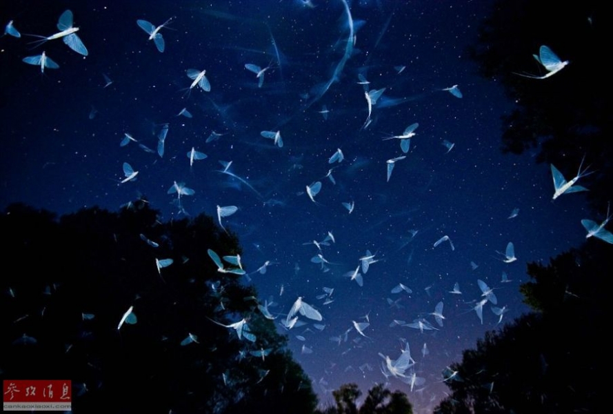 匈牙利摄影师Imre Potyó拍摄的星空之下蜉蝣云集的场面,他说:“蜉蝣是奇妙的群居动物,它们聚集在一起时的情景让人惊叹。”在拍摄中,他将照相机固定在三脚架上并且对着天空长时间曝光,在这个过程中同时使用闪光灯、手电筒等人造光源对场景进行适当的补光。