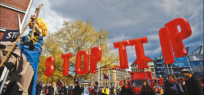 自2013年欧盟和美国启动《跨大西洋贸易与投资伙伴关系协定》(TTIP)谈判以来,欧洲国家的反对和抗议声不绝于耳。图为今年4月,德国民众走上街头抗议TTIP谈判。