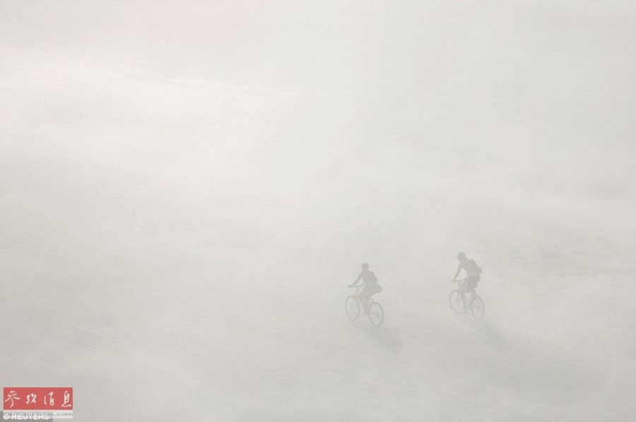 尽管活动中的能见度很低,但是节日中的人们仍旧进行着自行车、滑板等各项活动。