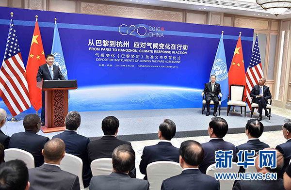9月3日,国家主席习近平同美国总统奥巴马、联合国秘书长潘基文在杭州共同出席气候变化《巴黎协定》批准文书交存仪式。 新华社记者李涛摄