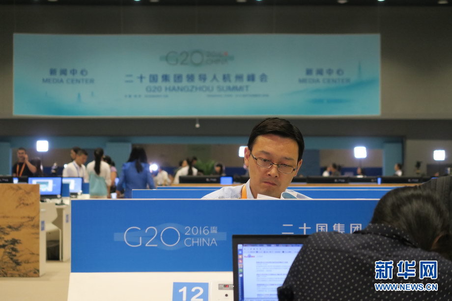 二十国集团工商峰会(B20)于9月3日至4日在杭州举办。作为G20机制的重要配套活动,B20是各国工商界参与全球经济治理和推动世界经济增长的重要平台。图为工商峰会开幕当天,新闻中心内记者忙碌的身影。新华网 陈竞超 摄