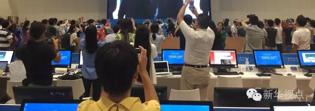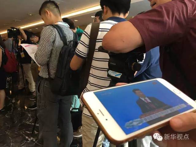 由于峰会现场场地有限,许多记者无法到会场实地进行采访报道。不愿错过精彩瞬间的他们架起“长枪短炮”,对准新闻中心内正在直播开幕式实况的大屏幕。